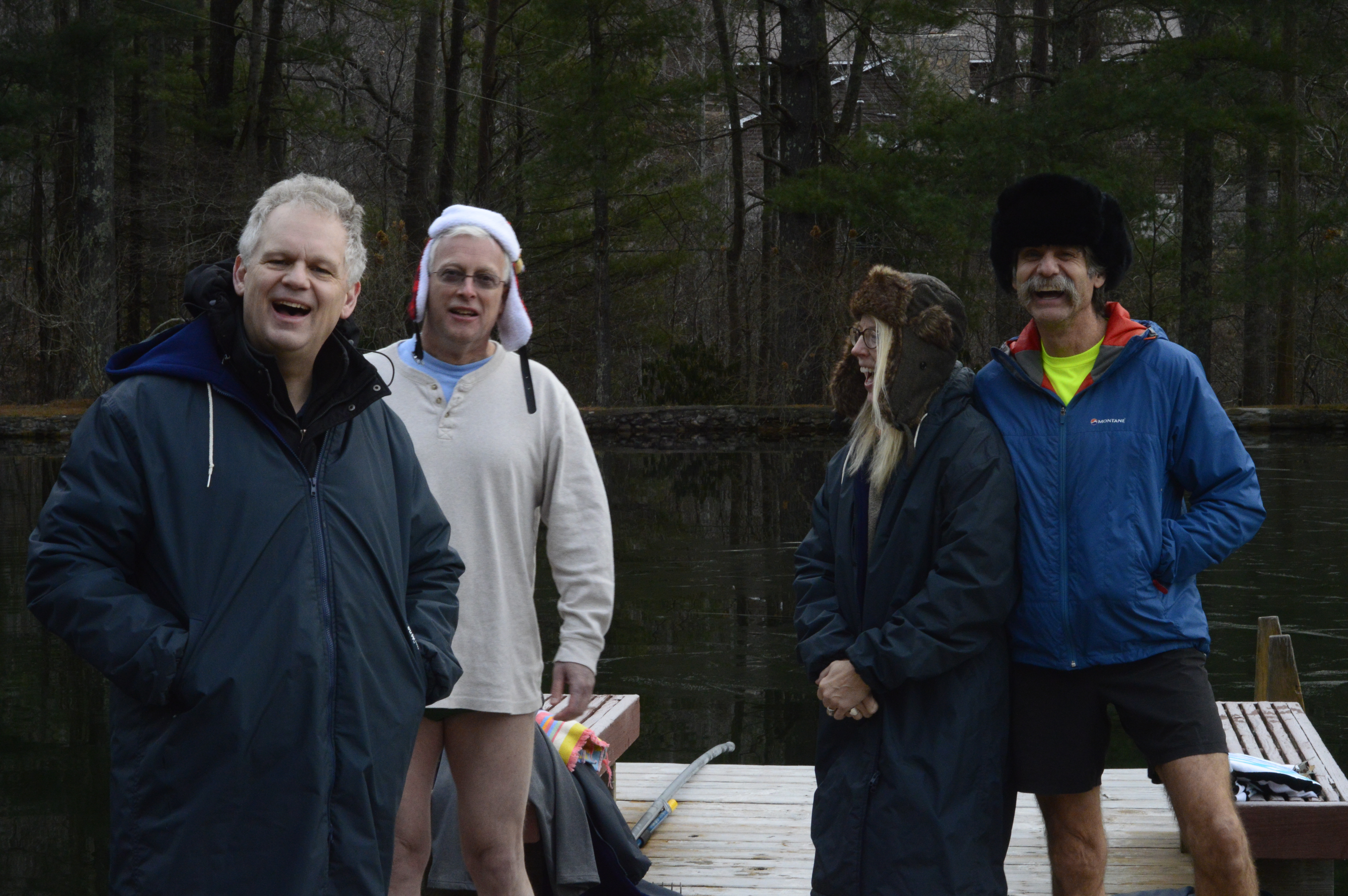 New Year’s Day morning found Asheville Masters Swimmers Jeff Weller, Lecky Haller and Andrew Pulsifer braving 24F air and 32F water temps at Bull Creek Pond in Riceville. Notice the layer of ICE on surface!
