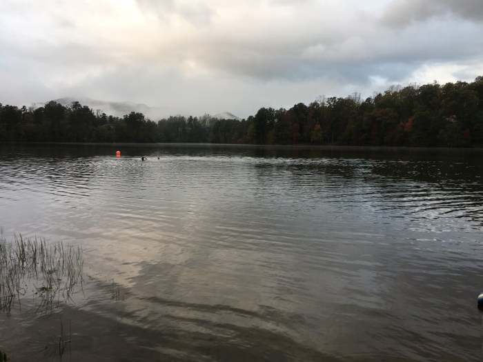 Lake is 58° today, and these three guys did multiple loops. I, on the other hand fully immersed, swam half way to first buoy-turned around and got out. With no sun on my body 58°was too cold to me today. These guys are studs! All three did wear wetsuits and a neoprene cap seemed to make a big difference.
