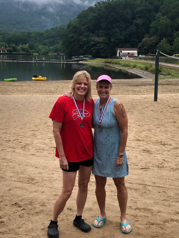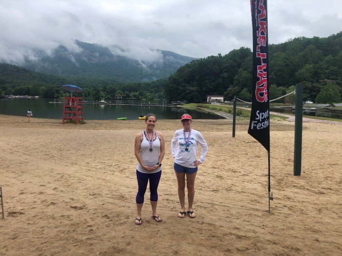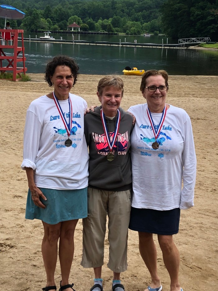Last Saturday (June 8th) Asheville Masters Swimming was very well represented at this inaugural event on Lake Lure! The 1.5 and 3-mile options had Asheville affiliates winning the longer swim overall, winning and placing very well in the age groups overalls, father and daughter and father and son swimming ‘together,’ thermals creating what our Mr. Brooks calls a 15° swing in temperature (unconfirmed!) and, of course, fun fun fun!! The scenery looked spectacular and a break in the rain allowed this all to happen. This is a beautiful venue!