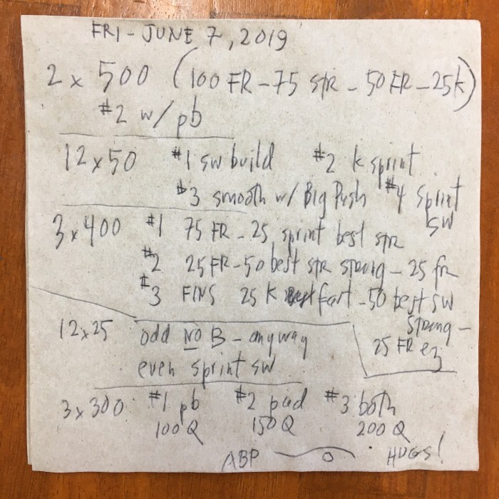 Here are a few workouts from the past two weeks and thanks to Sarah B. and Marty M. and Jeff W. and Adrienne K. for coaching and writing workouts.: