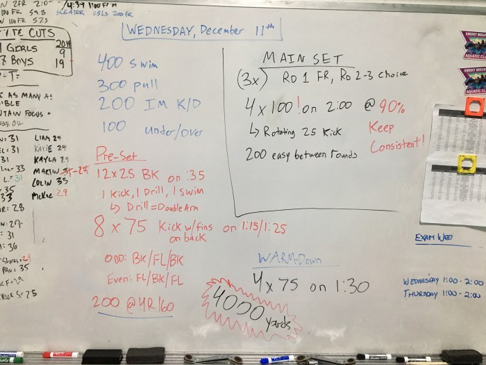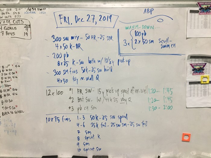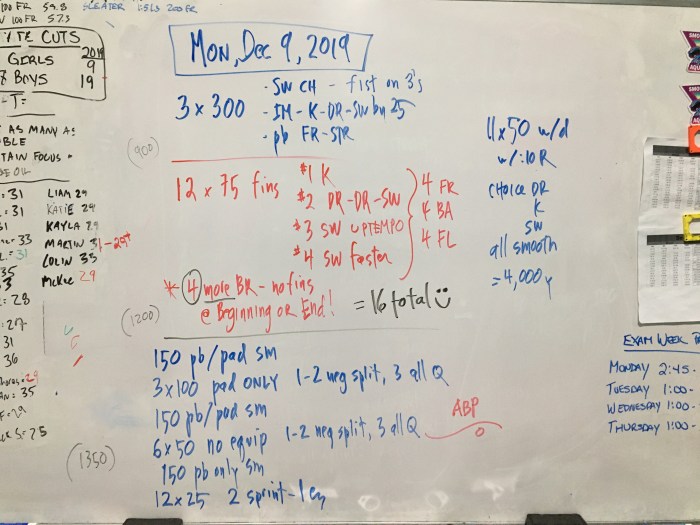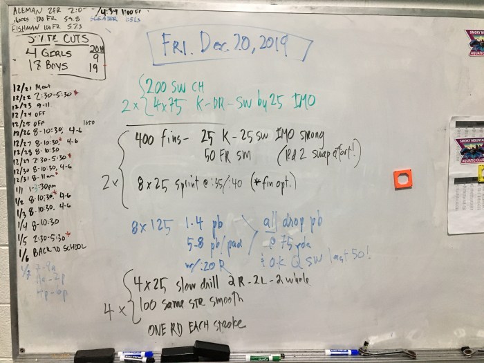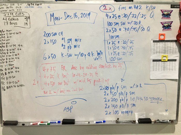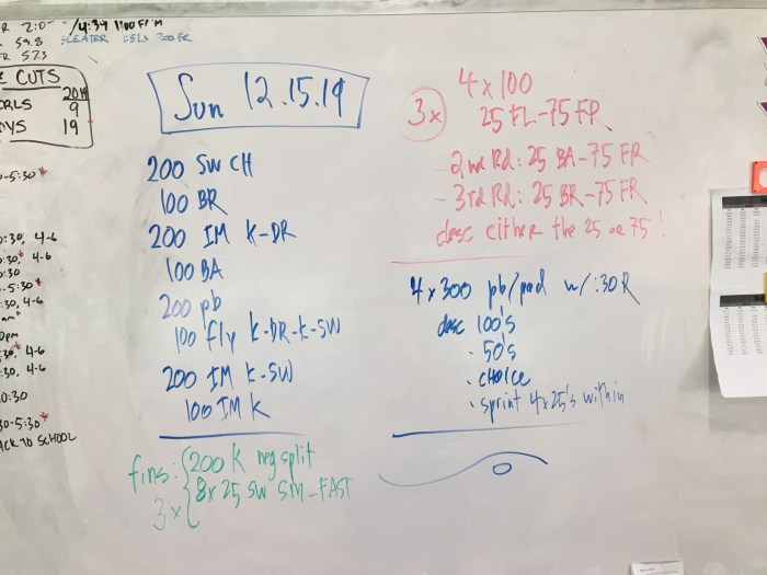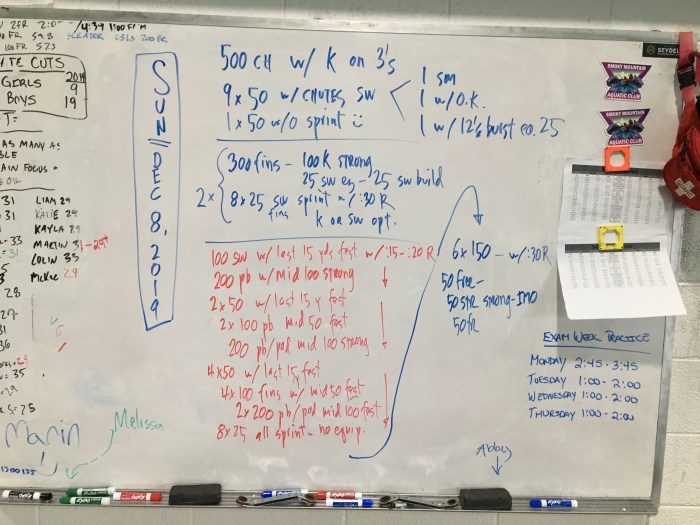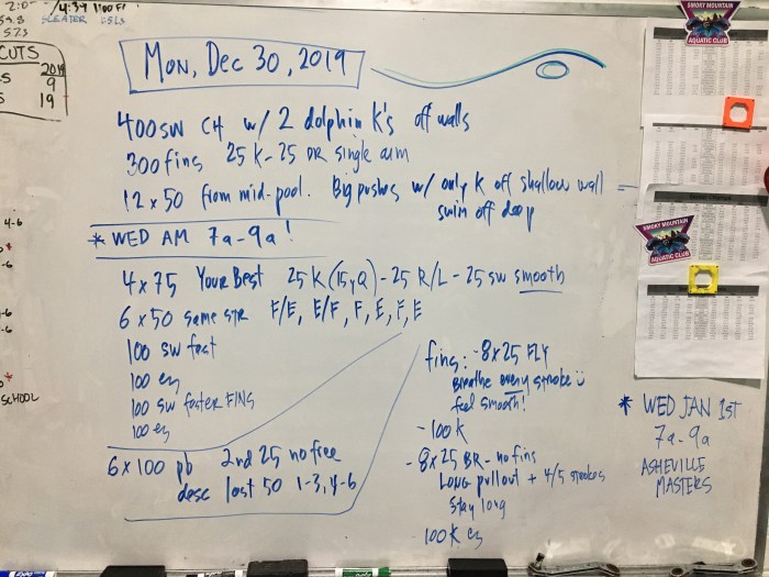 Come join us tomorrow, Wednesday, January 1 from 7 AM to 9 AM at the Asheville School pool. We will do what has become our tradition, swim every event offered at the NCAA Championships! Here’s what it looks like: