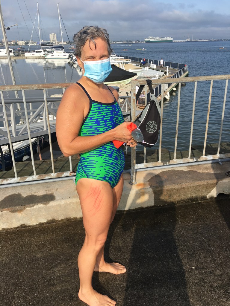 Adrienne says (and right leg shows) she “got blindsided by a barnacle loaded metal buoy 😳. The conditions were great. Minimal wind, water temp 76F. I actually had trouble sighting because there was so much going on in my field of vision and being inthe back of the pack so many kayaks blocking my sight so it was a little weird to work around that.” AK