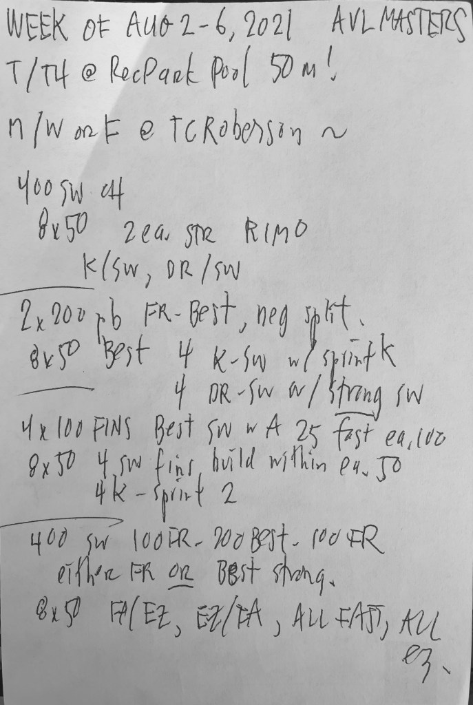 If you want to dive in on Monday Wednesday or Friday at the TCRoberson HS pool for uncoached time, hours remain the same for now, 6 AM to 8 AM and 11 AM to 1 PM. Here’s a work out for that: