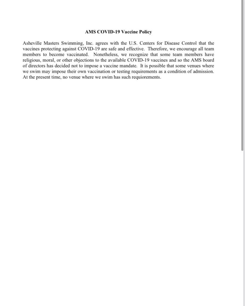 We’ve submitted a list of those that have paid 2021 dues to United States Masters Swimming under our Asheville Master Swimming club name, and that list will be at the security gate house. I’ve added a couple people that have not yet paid that have been swimming with us regularly. A $10 drop in fee will suffice tomorrow for anyone not yet able to pay online. A check works, too.