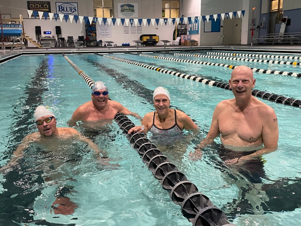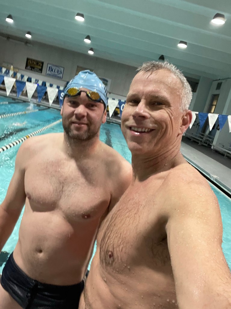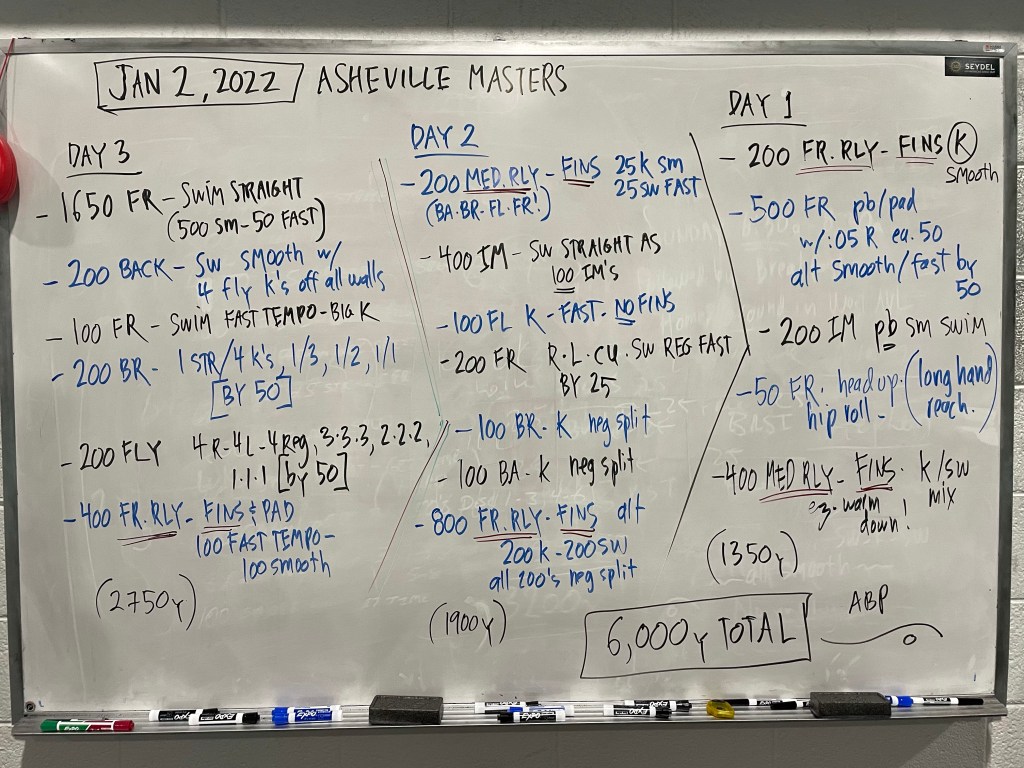 Nine of us gathered on Sunday morning, January 2nd to tackle a newly adjusted version of our annual tradition of swimming the former 3-day college championships schedule around the New Year, which totals 6,000 yards!