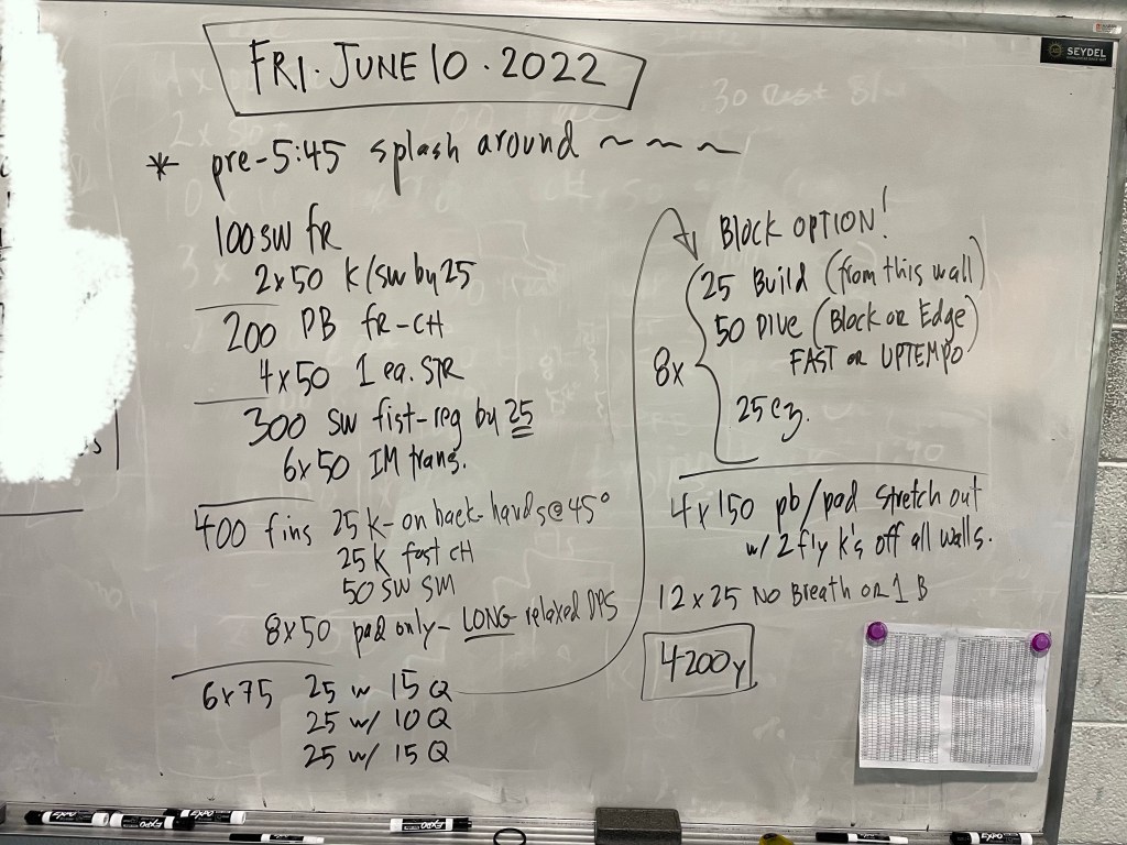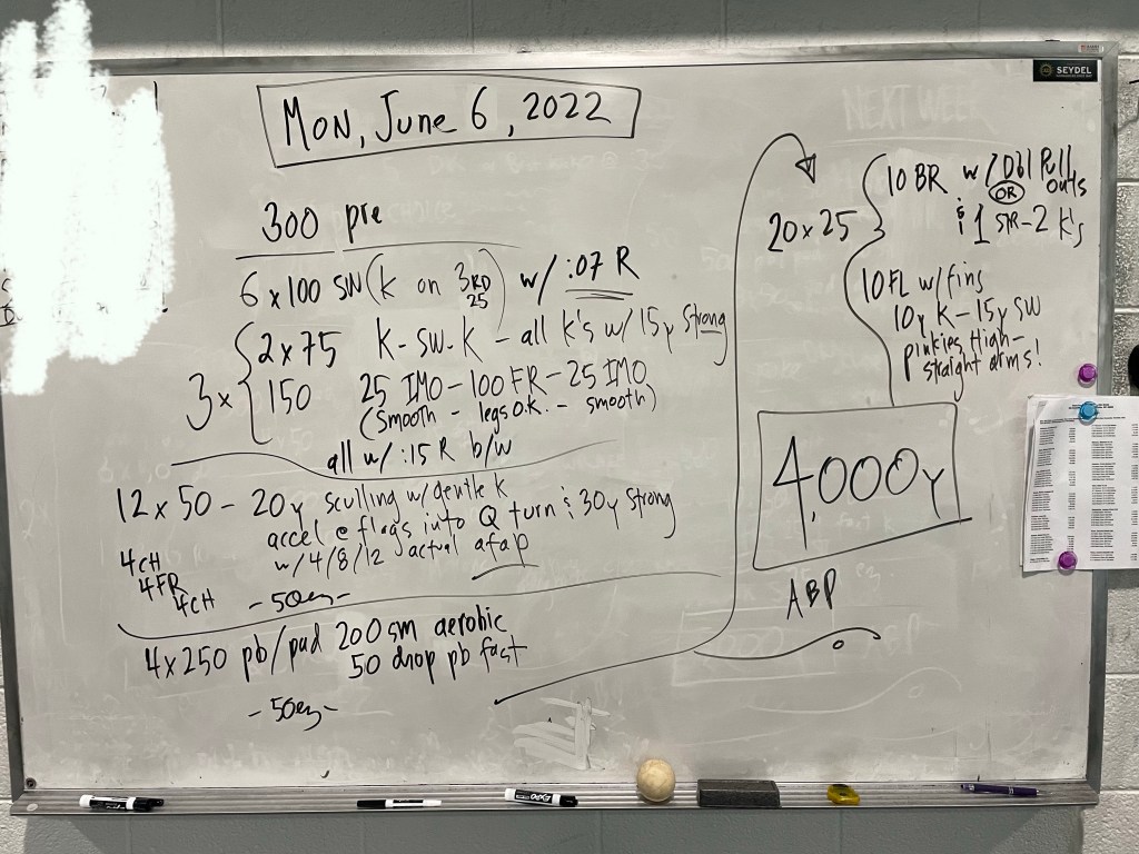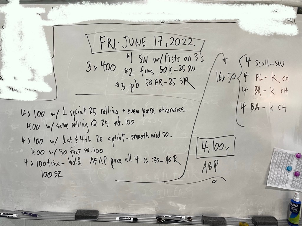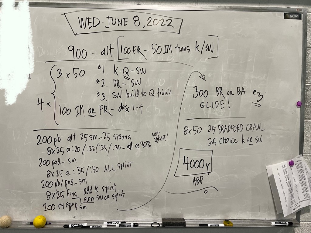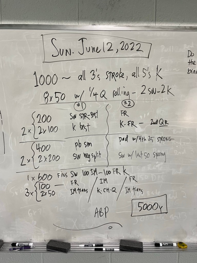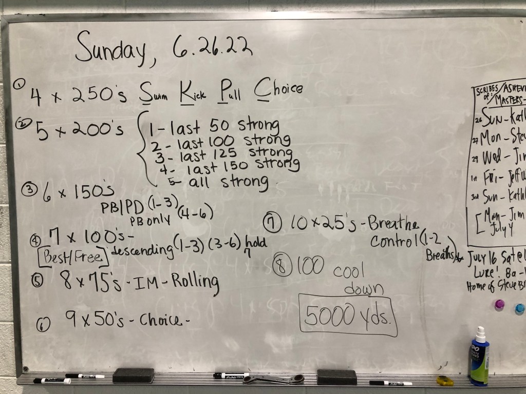 Greetings! Thank you to Kathleen Moore for writing our Sunday work out today (and next week!), we have a lineup of generous swimmers willing to write workouts this week and we thank them in advance!