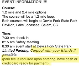 If you need to give up your number for any reason in the next two days, please let the race director, Steve Scott know immediately by sending him an email here: upstatesplash@gmail.com or text/call him at 864.349.7615