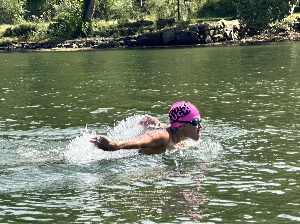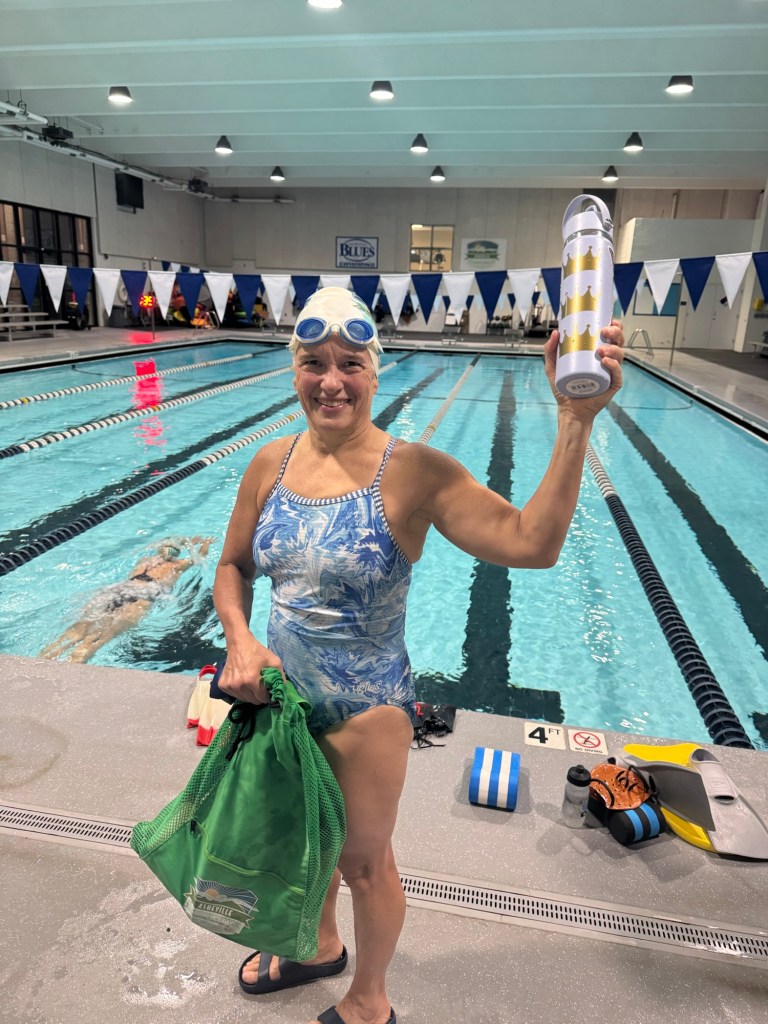 Congratulations to Adrienne Kramer as she persevered to train another year to complete the Golden Triple Crown all whilst swimming the Butterfly! For 21.2 miles.