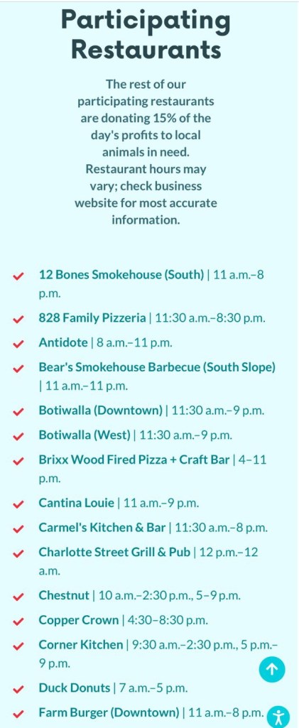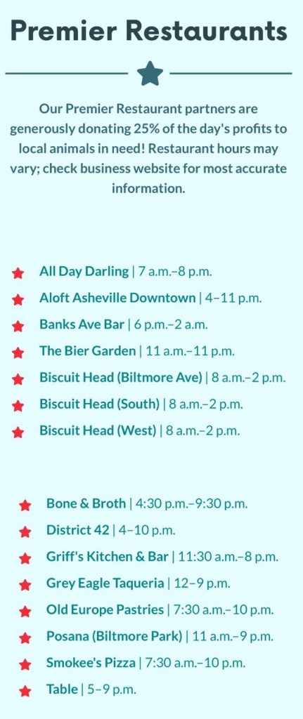 Our friend and lane mate Kathleen Moore is very involved in the local Asheville Humane Society, and tomorrow they are having their annual day of giving through the “Dine to be Kind” program seen here.